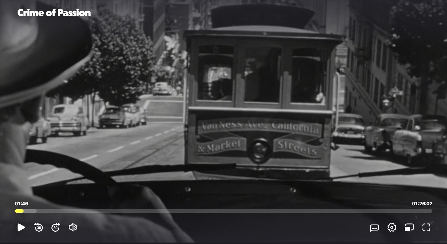 Thanks to Jack Tillmany for recommending this movie, about a former cop who tries to solve a murder to get back onto the force, "actor Hugh O'Connell tries, but fails, to catch a Hyde Street cable car as it descends the hill around Francisco St." I made a few screen captures from YouTube: