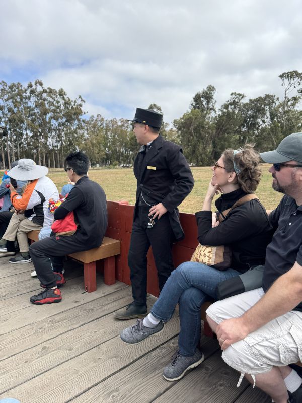 On the Saturday of Labor Day weekend, we went to the 22nd annual Washington Township Railroad Fair at Ardenwood Farm in Fremont. The weather was uncomfortably hot. Turnout was good year. Not many people wore masks. Plymouth locomotive Katie pulled her train from Deer Park to the car barn, where they had just built a track loop. A brakeman said that they were able to carry more people by going that way instead of from Ardenwood Station to Deer Park. They had to load and unload the train only once each trip because they did not stop at the car barn. There were no operating steam locomotives, but the Society's recently acquired locomotive, Argent Lumber Company 5, a 2-6-2 Prairie built by Lima in 1910, was on display in front of the car barn.