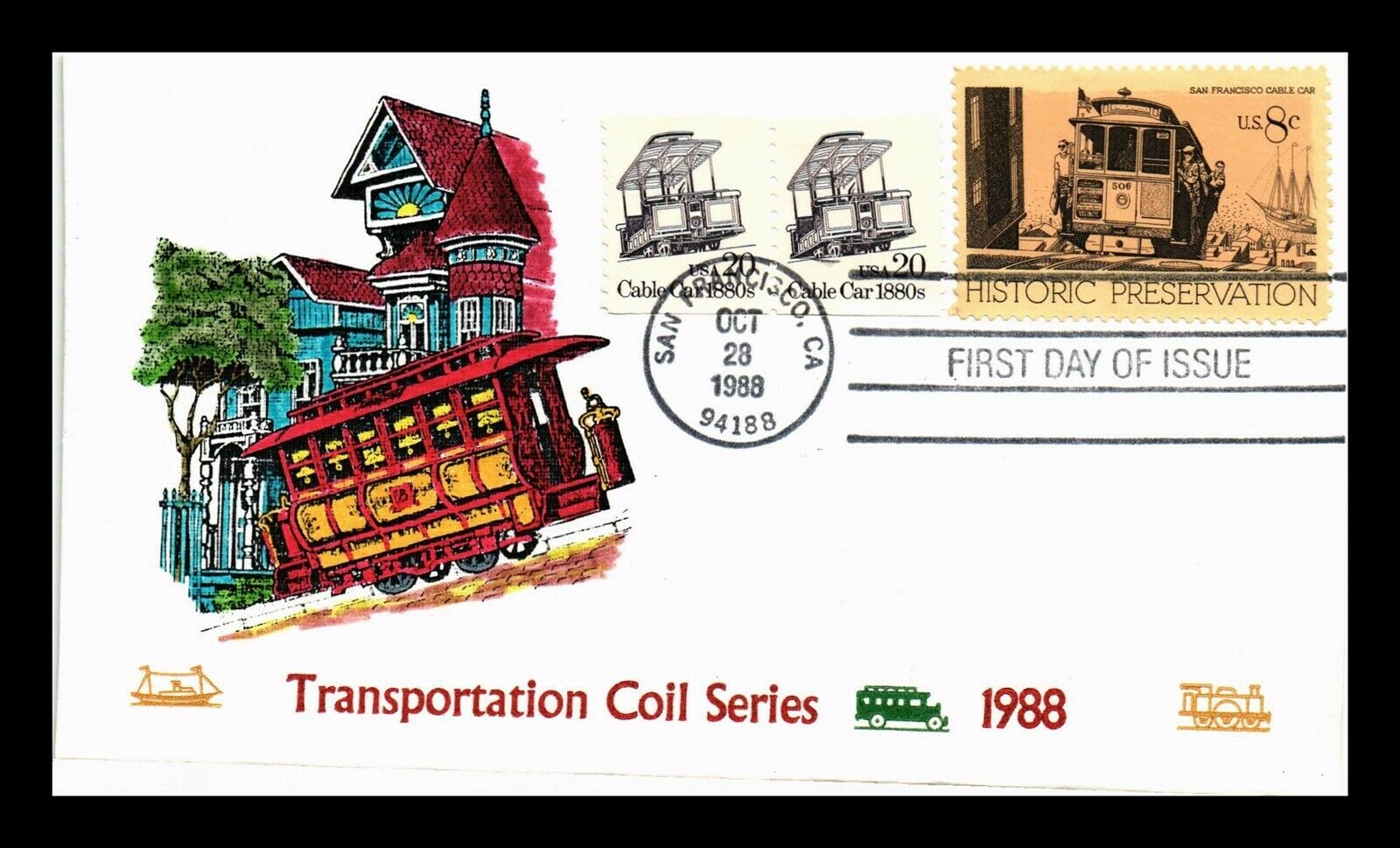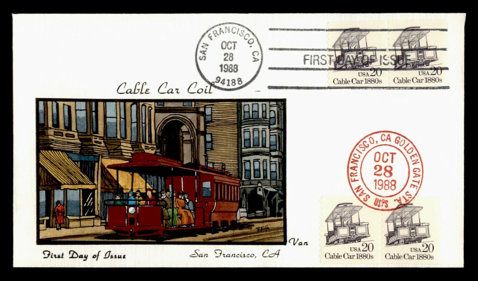 the 1988 centennial of the Powell Street cable car. The front shows a Powell Street cable car