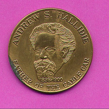 the centennial of the cable car. The front shows Andrew S Hallidie. The back shows