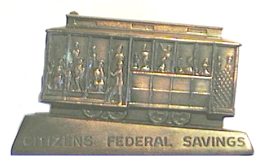 Citizens Federal Savings issued this metal bank in the shape of a cable car