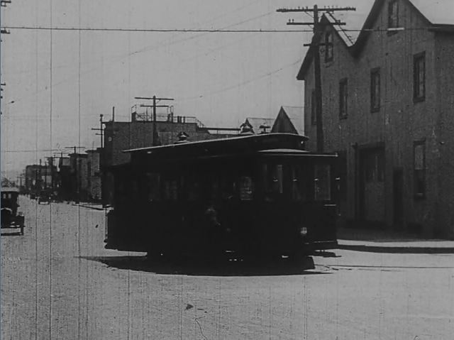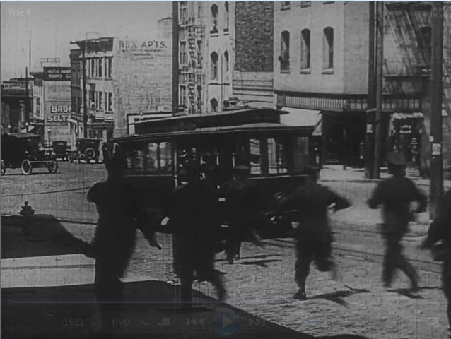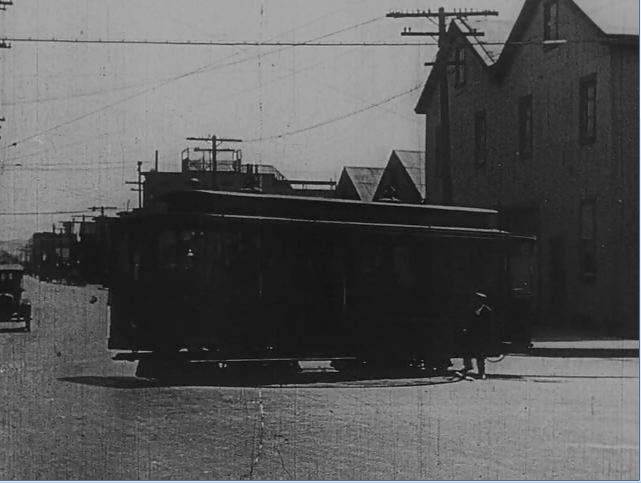 Check the Internet Movie Database Daydreams"In 'Daydreams,' a two-reel comedy from 1922, partially filmed in San Francisco, Buster Keaton, as the hapless hero, is pursued by cops, escapes by grabbing a Northbound Powell Bay cable car, which he rides around the turntable at Bay Street, and hops off later on Columbus Avenue. Later, there's a gag wherein a legion of cops are hiding on what appears to be an empty MSRY #27 Line streetcar on Second Street, and he once again attempts an escape by taking a ferryboat. "Interesting to note that this makes TWO films from 1922 both of which show the Powell Street cable car on the turntable at the Bay Street terminal, the other one being Moran of the Lady Letty with Rudolph Valentinto, which I reported to you previously." After I got this movie on DVD, I made some screen captures: