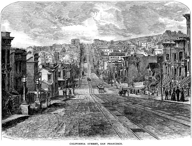 As we ride along, a daintily gloved finger hails the driver, from the sidewalk, and our car comes instantly and quietly to a stand-still, while the gentle maiden mounts the low step and comfortably seats herself; then, at the bell-signal from the conductor, the sturdy driver grasps his lever, clamps down his iron brace grappling the cable, and again we are off, with far less jar and jerk than we receive in a horse-car. Over the hills we go, through a fine broad street, views all about, of shining bay, busy city, and flower-clad mountain, past beautiful private residences kept with a neatness and care peculiar to the front yards of the San Franciscans. Callas bloom luxuriantly among palm-trees, and showy flowers in the gardens regale the eye the year round; and in the summer season the traveler fills his lungs with an air, the purest possible, coming fresh and bracing from the sparkling ocean, laden with the perfume of acres of blue and yellow wild Lupin.