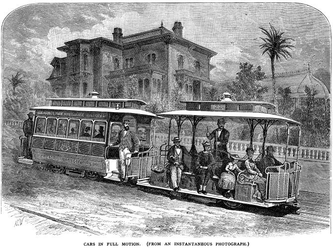 One feature of the sitting accommodations is that of a low rail, about an inch high, dividing each seat from the next, just high enough to make it uncomfortable to sit upon; gently hinting to those inclined to crowd their fellows that a seat was intended for one only. The cars are built so low that the feet of passengers are but twelve inches above the street they are traveling, thus giving that charm one experiences when sailing in a low skiff, close to the water, but which is lost on the high deck of a steamboat. The illustration above is made from an instantaneous photograph of the so-called dummy and passenger cars, coming down the grade at full speed. The dummy is a light, picturesque, open car, arranged with outside seats, and is generally preferred by passengers to the close car.