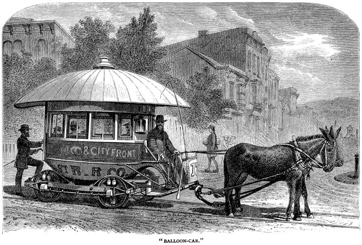 Among the oddities here in the car line, is the "balloon car," a picture of which is given with driver and mule attachment. These little "band-boxes on wheels" are intended for turning quickly on their trucks, at the end of a route, without changing the position of the wheels, the driver keeping his seat. A bolt is withdrawn, enabling the mules to pull the upper part of the car entirely around, in readiness for a return trip; the waiting passengers jump in, and off it starts, a fat, lumbering little thing, in jerky contrast to its elegant rivals so delightfully towed by rail.