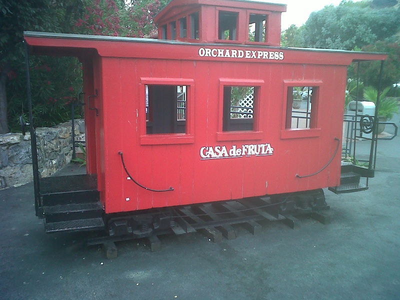 On the way back from our Disneyland, 2013 trip, we took I-5 instead of 101. After crossing the Pacheco Pass, we made an early-morning stop at Casa de Fruta. A tour bus had arrived just ahead of us, so there was time to look around at the railroad.